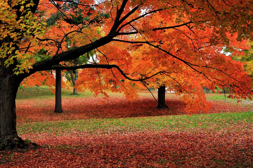 except the sun was shining on the red leaves